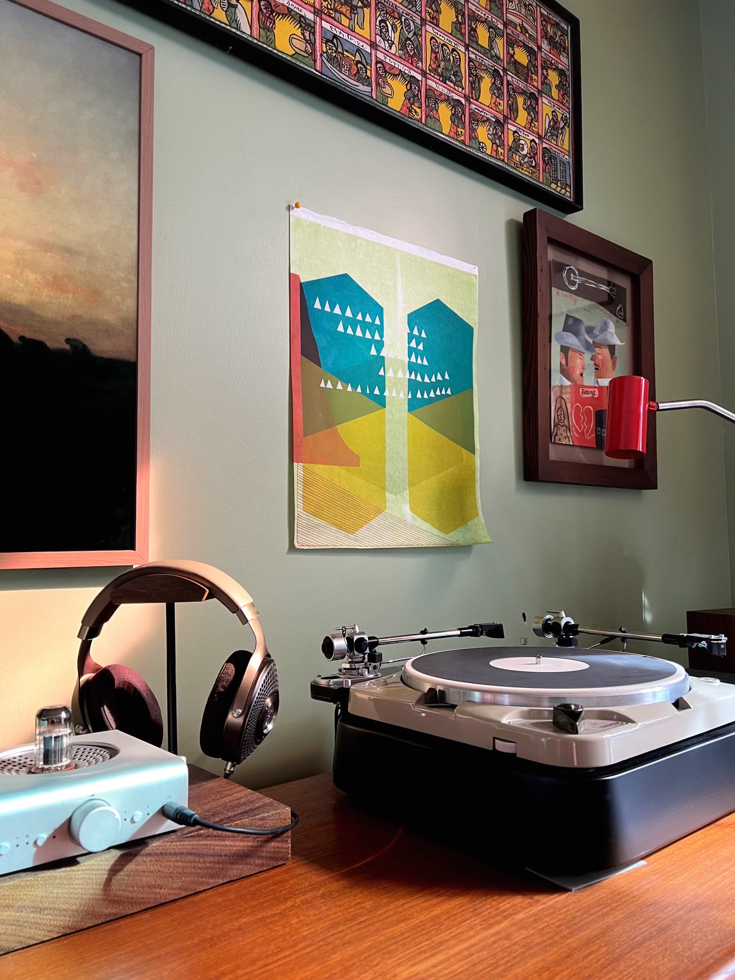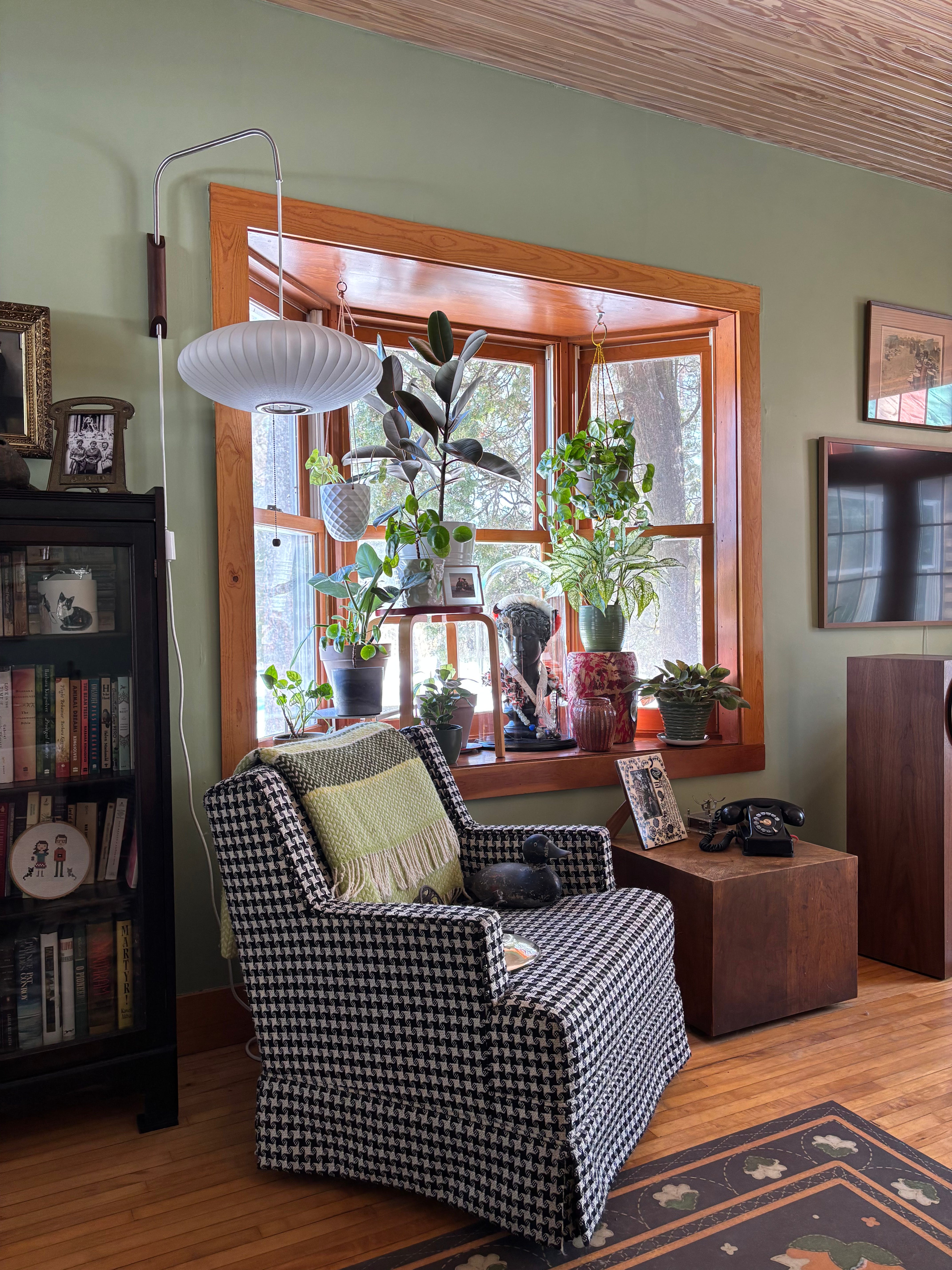 We decided on a dark, rich green, to pull together all the textures and pieces of framed artwork. We wanted cozy and cocoon-ish since it’s the room with all the records and books and the tv - the place where we end our evenings with a movie or YouTube videos about art restoration (which is TOTALLY addicting, by the way. Watch this person and try to tell me otherwise). So it always felt like it should be dark and well, like a library.