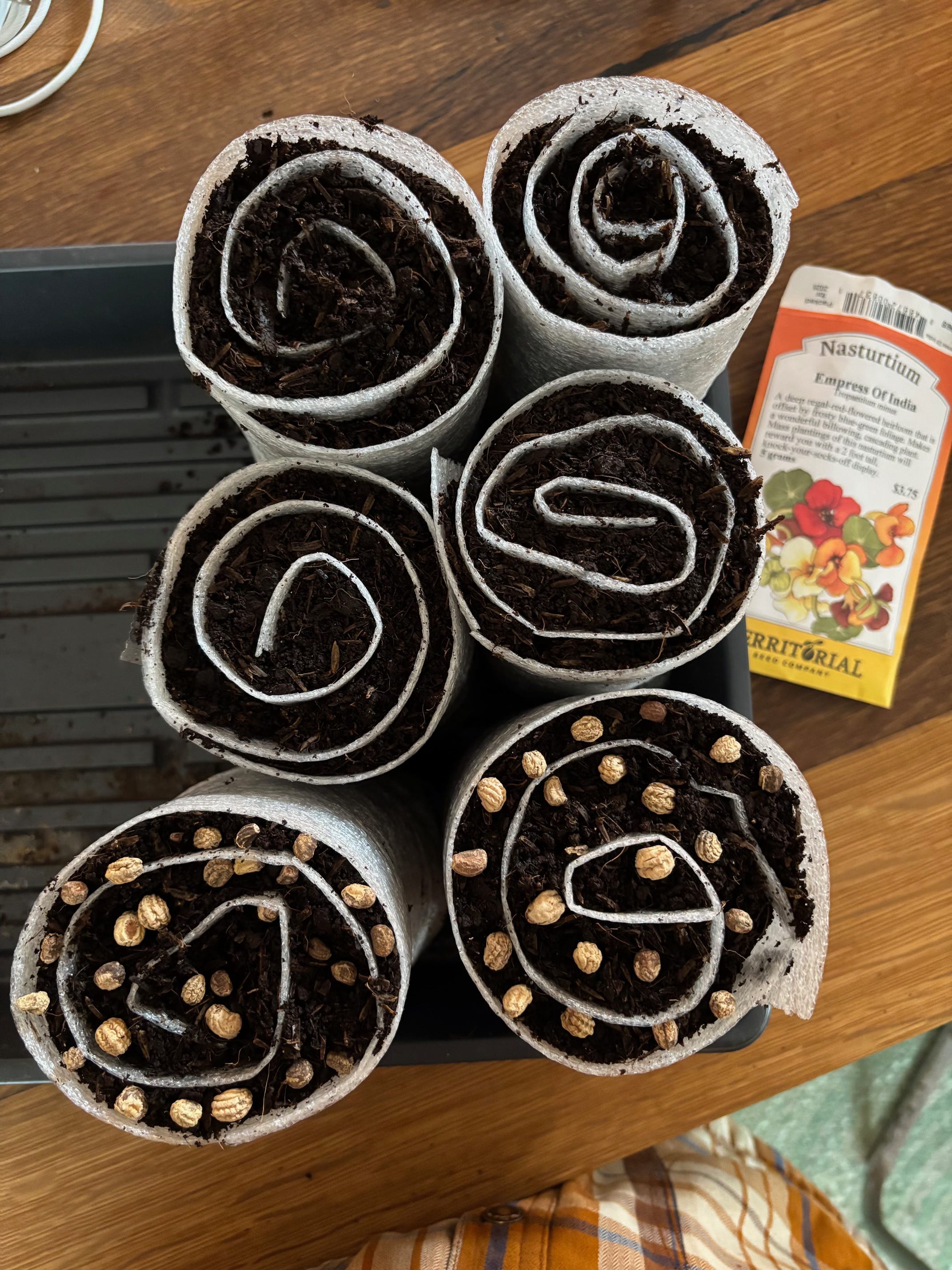On Sunday I started some herbs and flowers, using a SUPER FUN METHOD that saves a TON of space. I saw it on Instagram last year and tried it that very same day. It works so very well and I really like this method for things that I want a lot of — herbs, onions, marigolds, nasturtiums. I learned it from this person who calls them Seed Snails. And it is GENIUS.