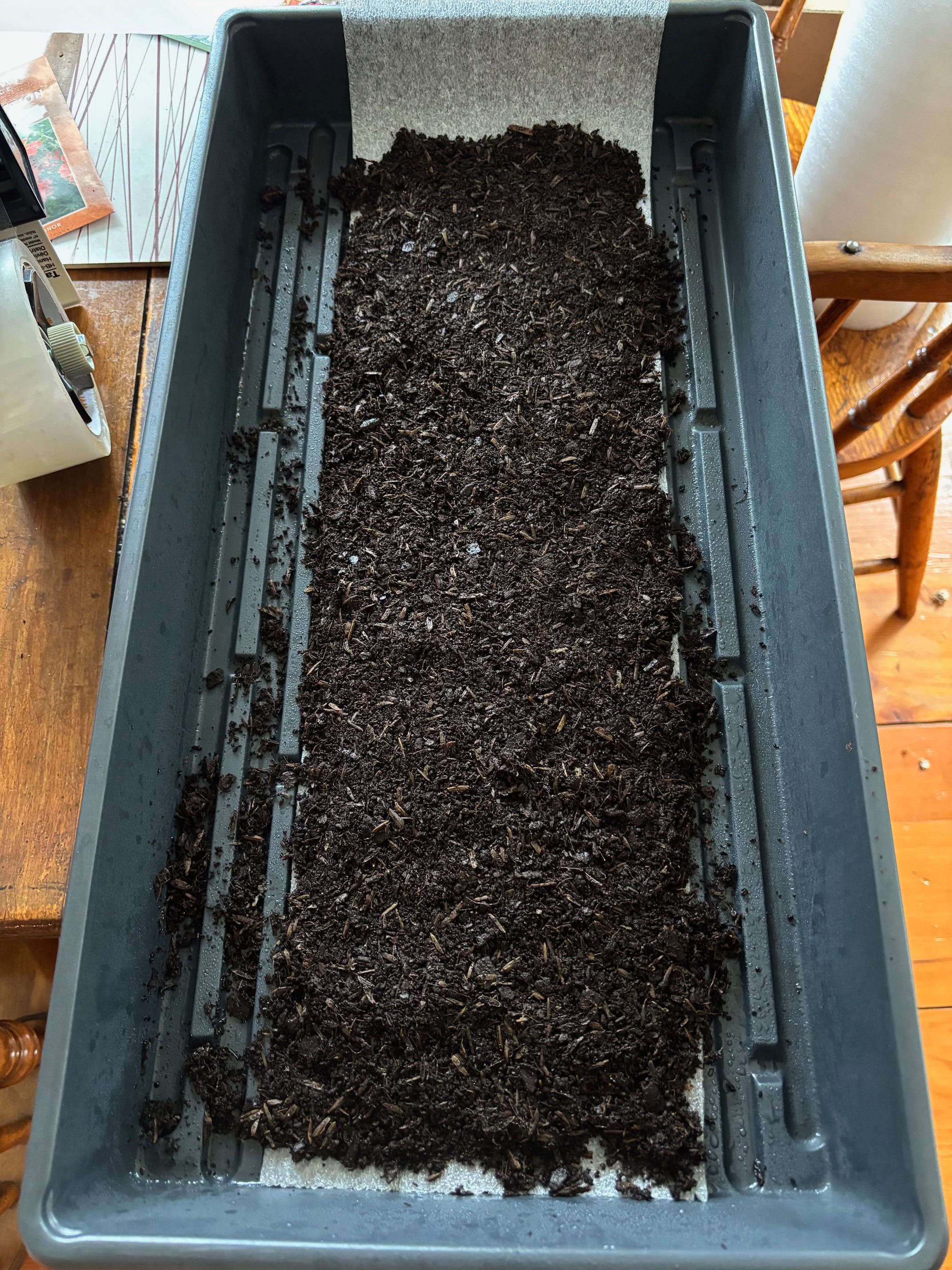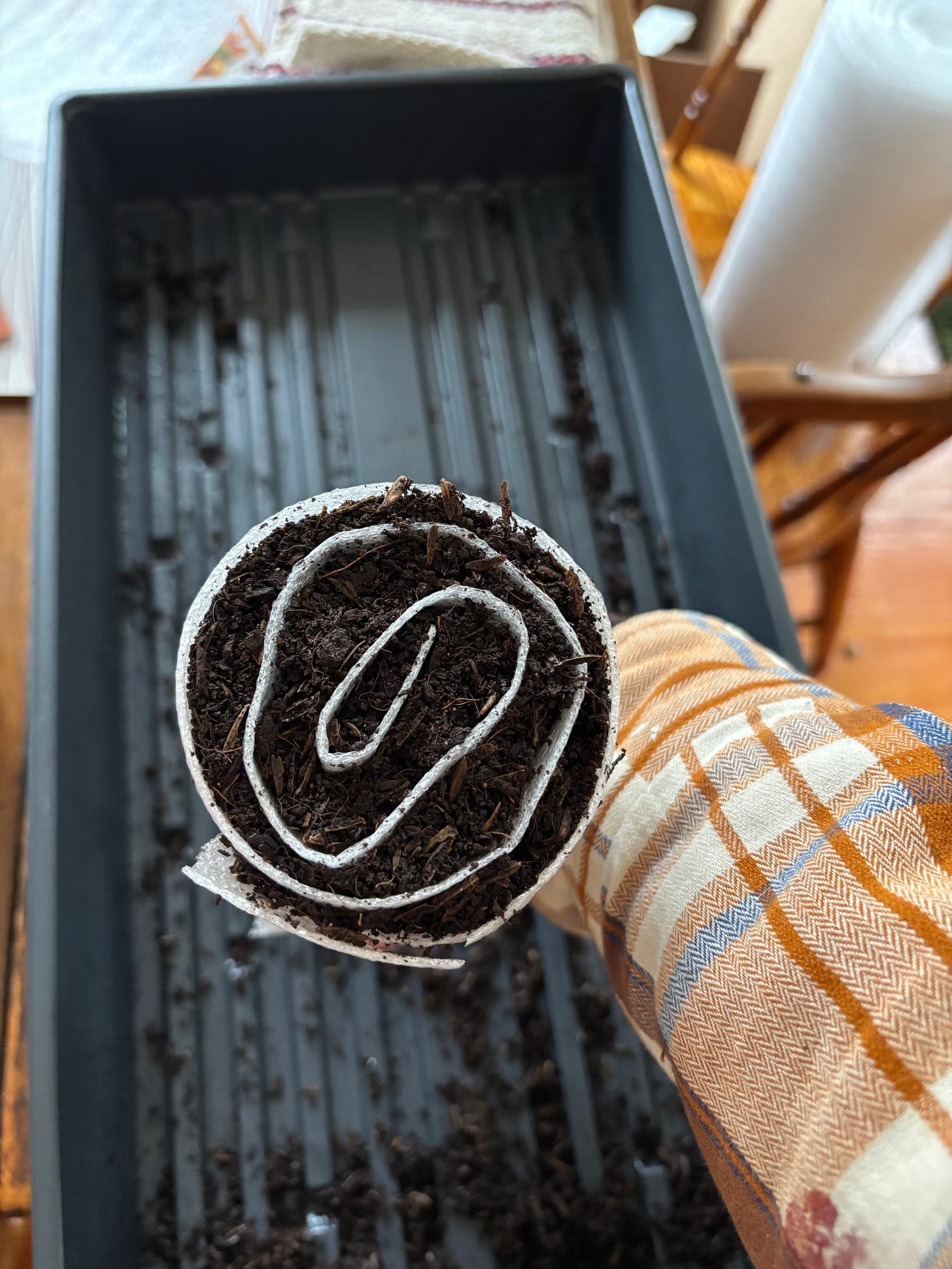 Ok, now roll up the whole thing, not super tight, but tight enough to hold it together. The soil will push its way up the wrap, so having those few extra inches on the back end is helpful. Now you’ll tape it up the side and gently tip it over to fill in the bottom and top of the “snail” with the soil that fell out. I keep my hand underneath to hold any loose soil in and transfer it to a tray to sit upright.