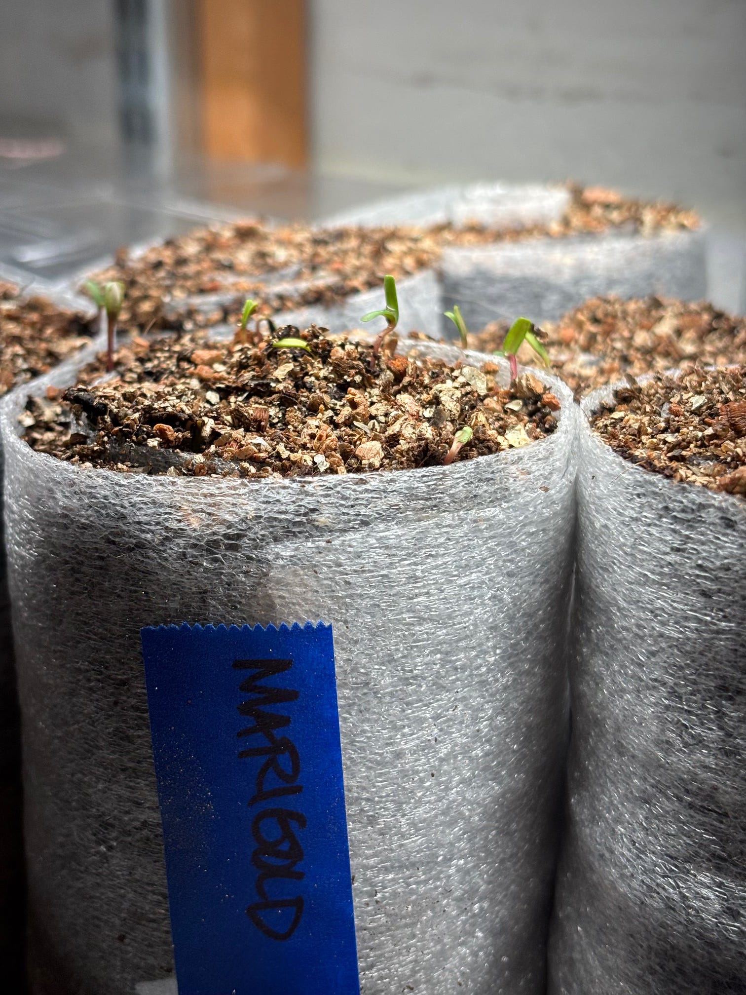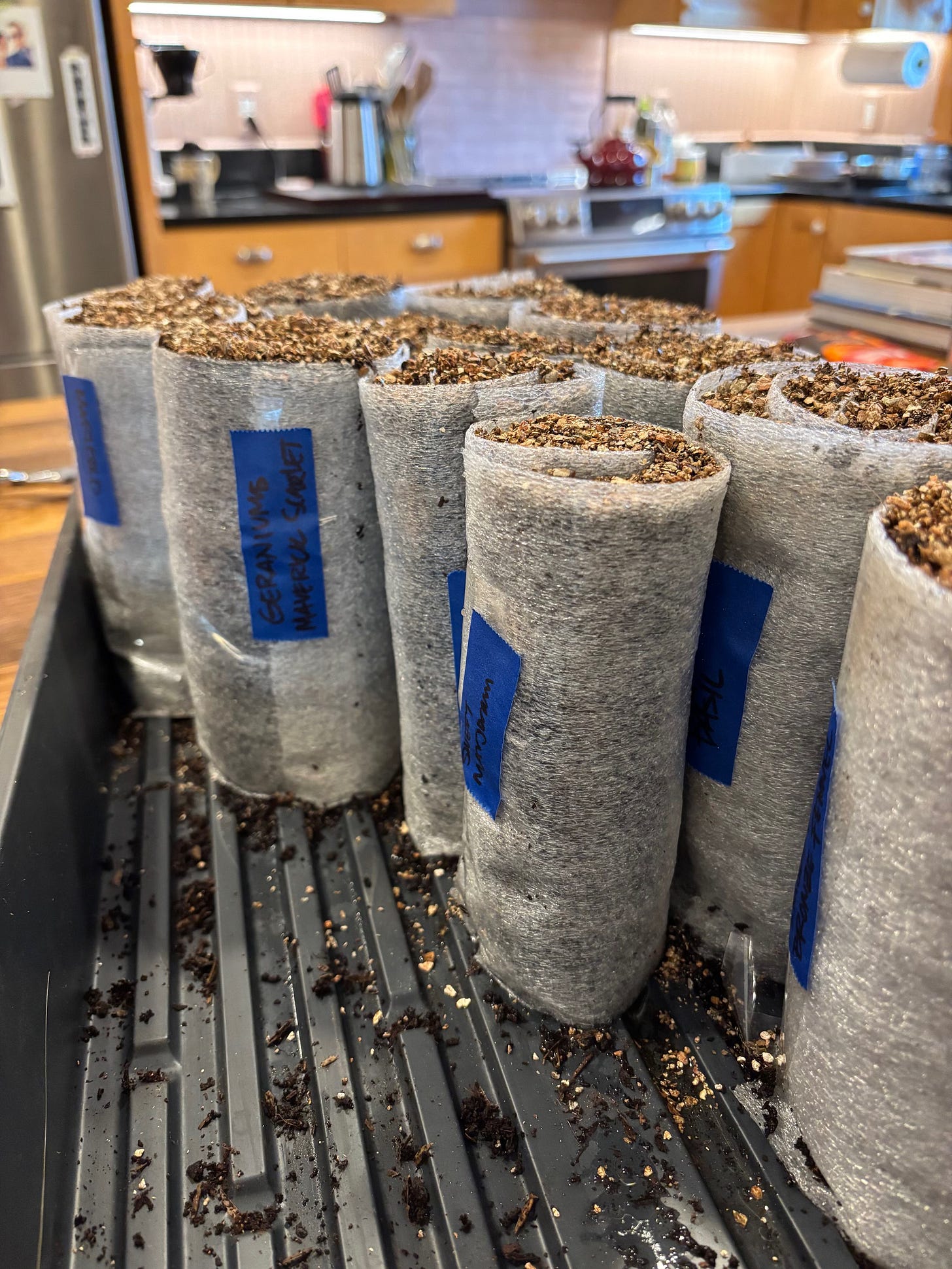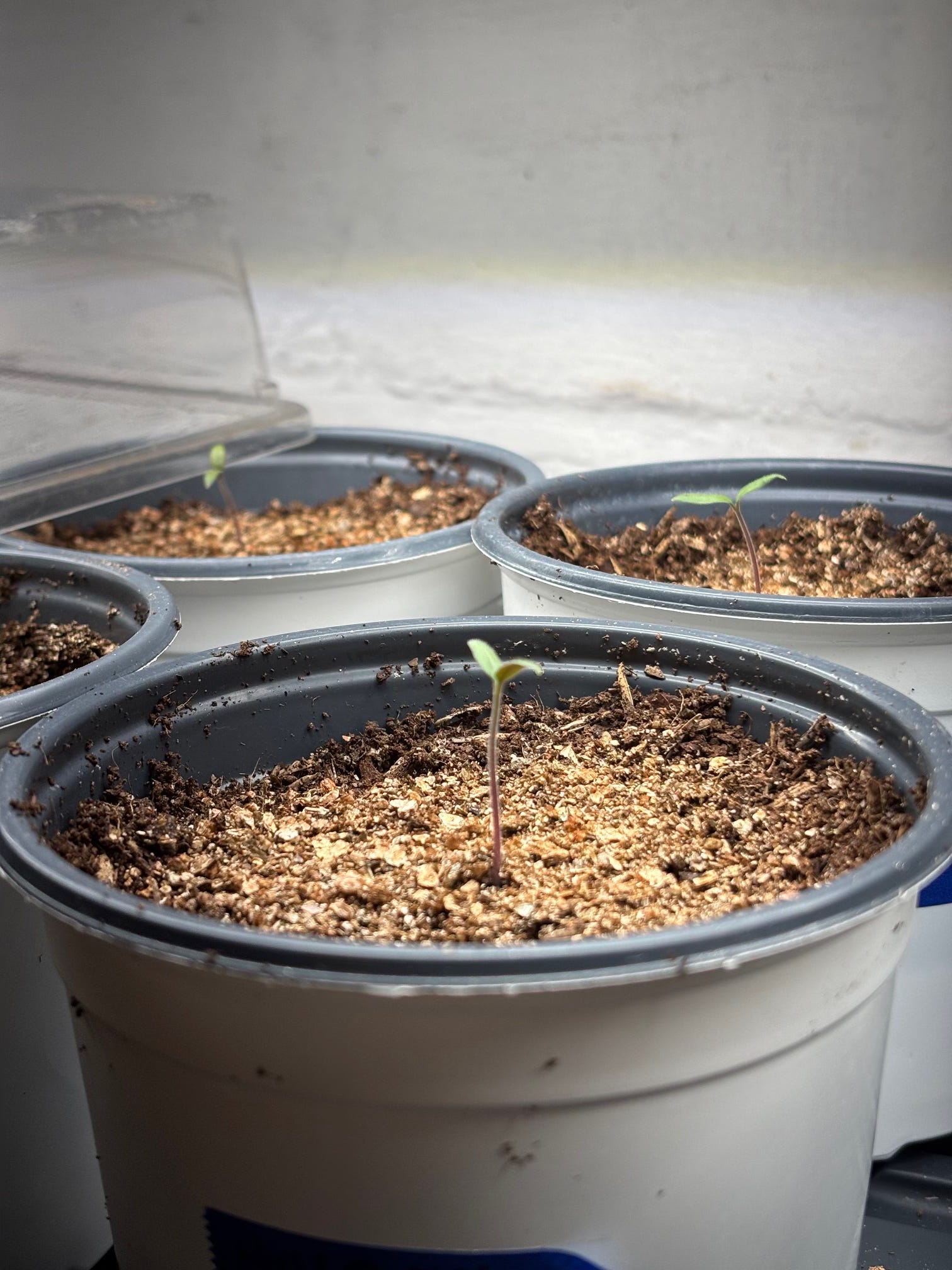 After I got these all planted, they went under the grow lights with another plastic bag from the recycling bin loosely draped over the top to keep moisture in.