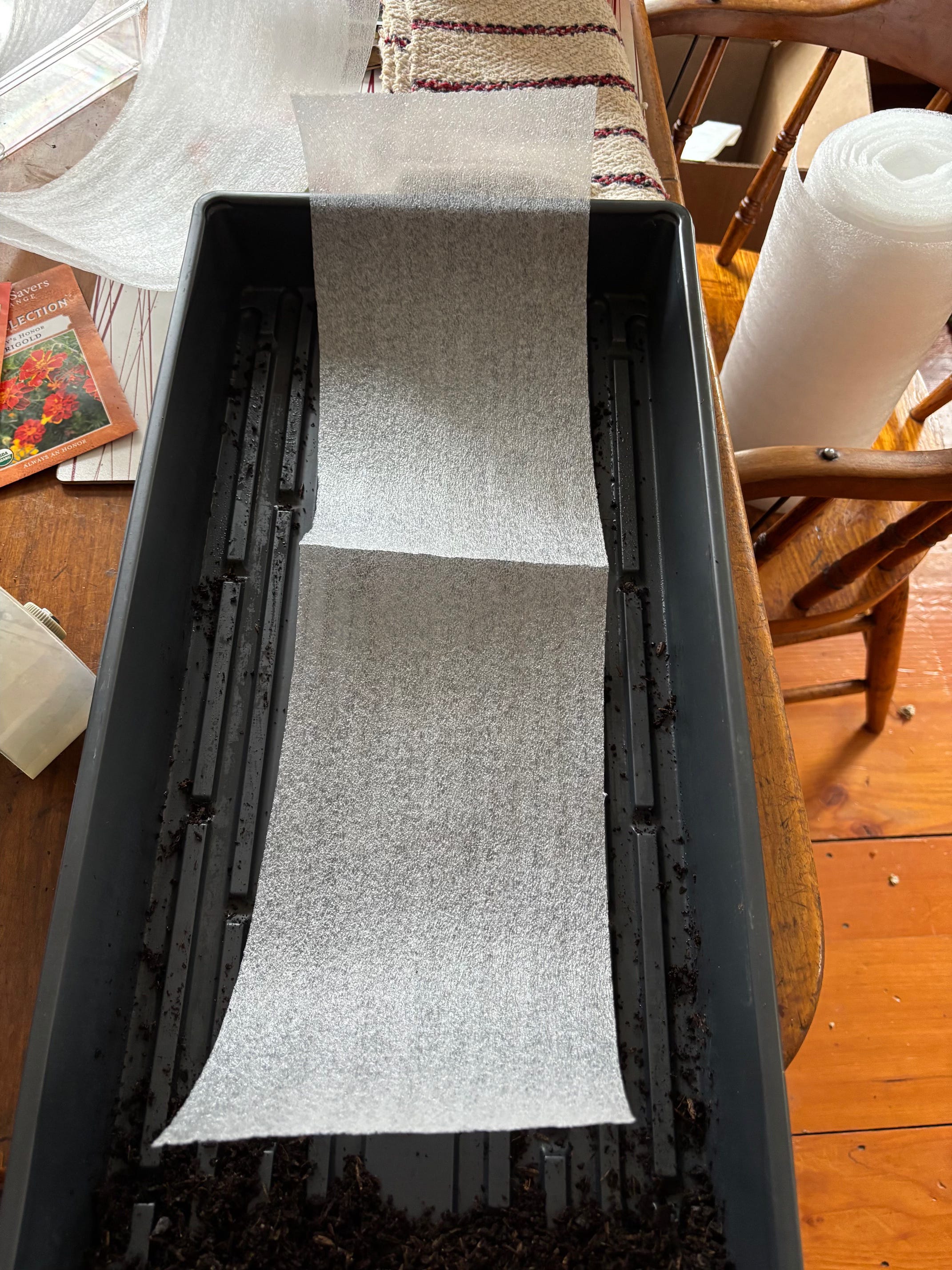 After you’ve made your seed snails, now you plant! You can get a lot of seeds in this small space. The idea is that when you unroll it after the seedlings are going, the roots are strong and deep, the plants are neatly side-by-side, and it is super easy to gently lift them out of their snail for planting. It saves on soil, space, time and effort and it really is a genius way to start seeds. BIG FAN.